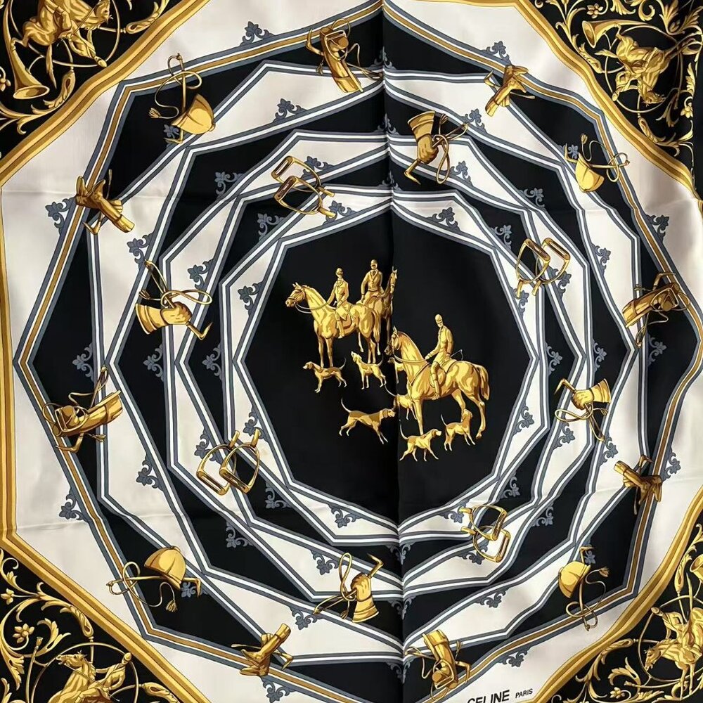 This scarf from CELINE features a horse and jockey design and an appealing contrast of black and gold.