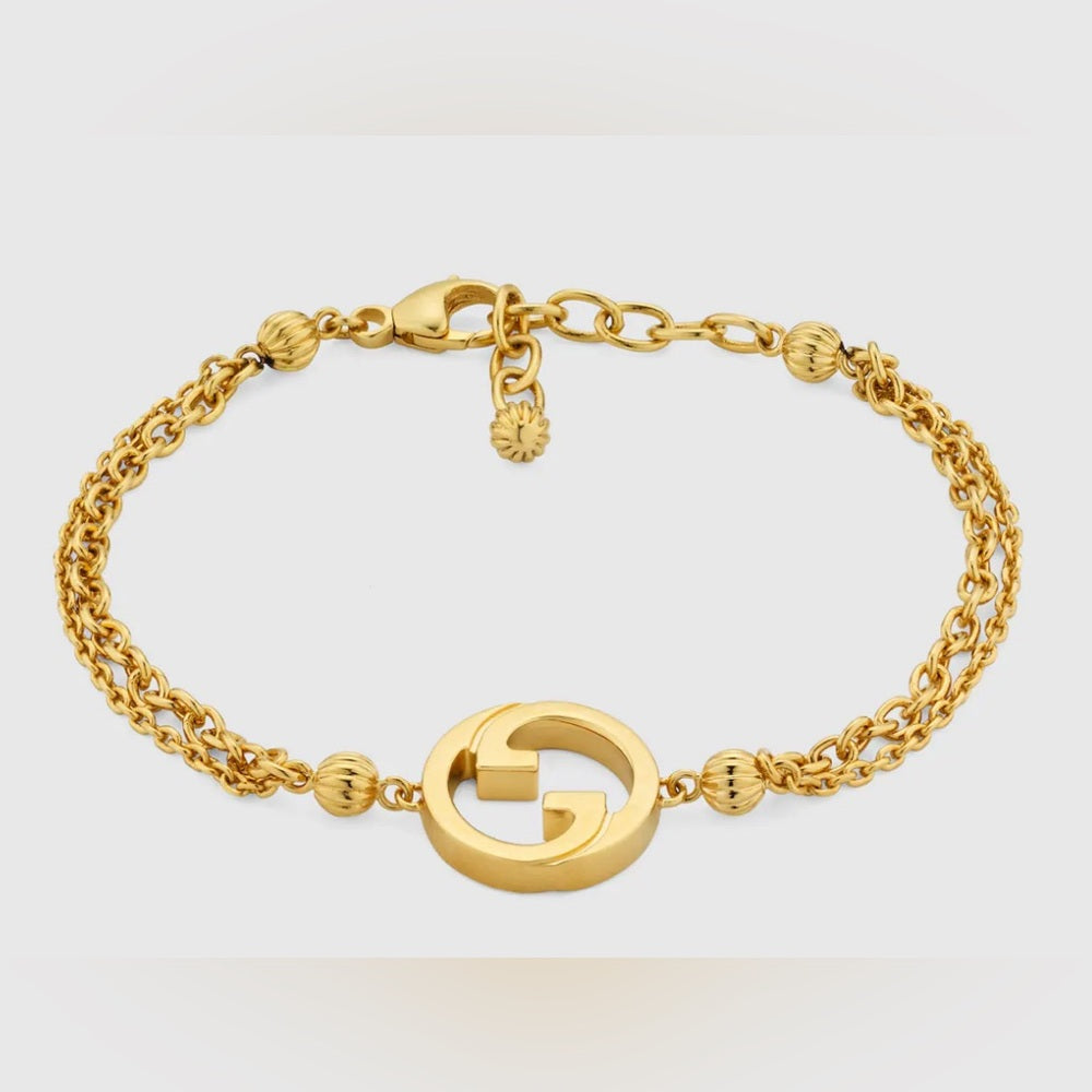 This exquisite Gucci bracelet features a delicate gold finish, showcasing a timeless and versatile design. Crafted with precision, the bracelet's smooth links create a continuous and flowing piece of jewelry. Perfect for adding a touch of luxury to any ensemble.