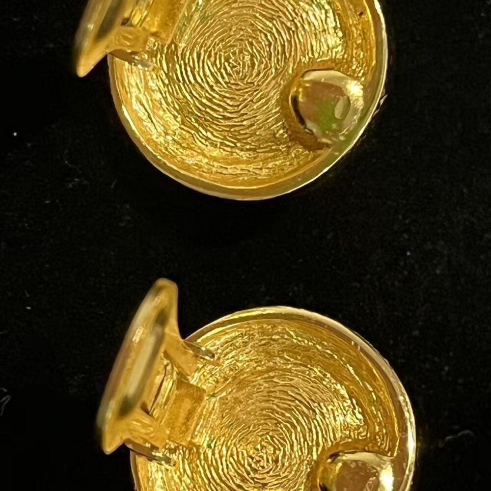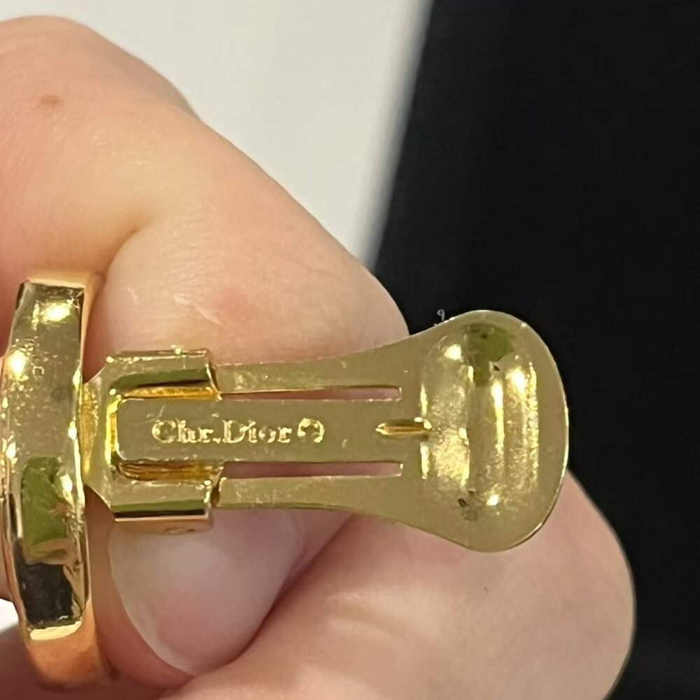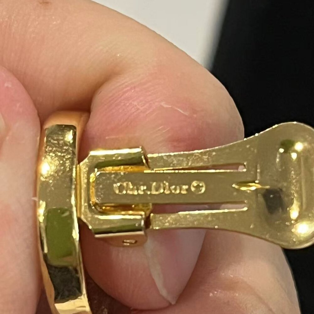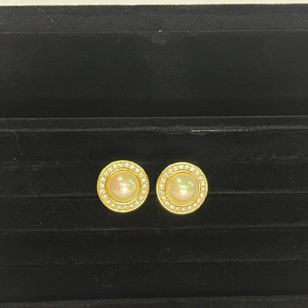 This is an elegant vintage CHRISTIAN DIOR designer signed gold plated faux pearl and crystal pair of clip on earrings dating to 1980's. The classic earrings feature a round faux pearl in the center and is accented with sparkling crystals