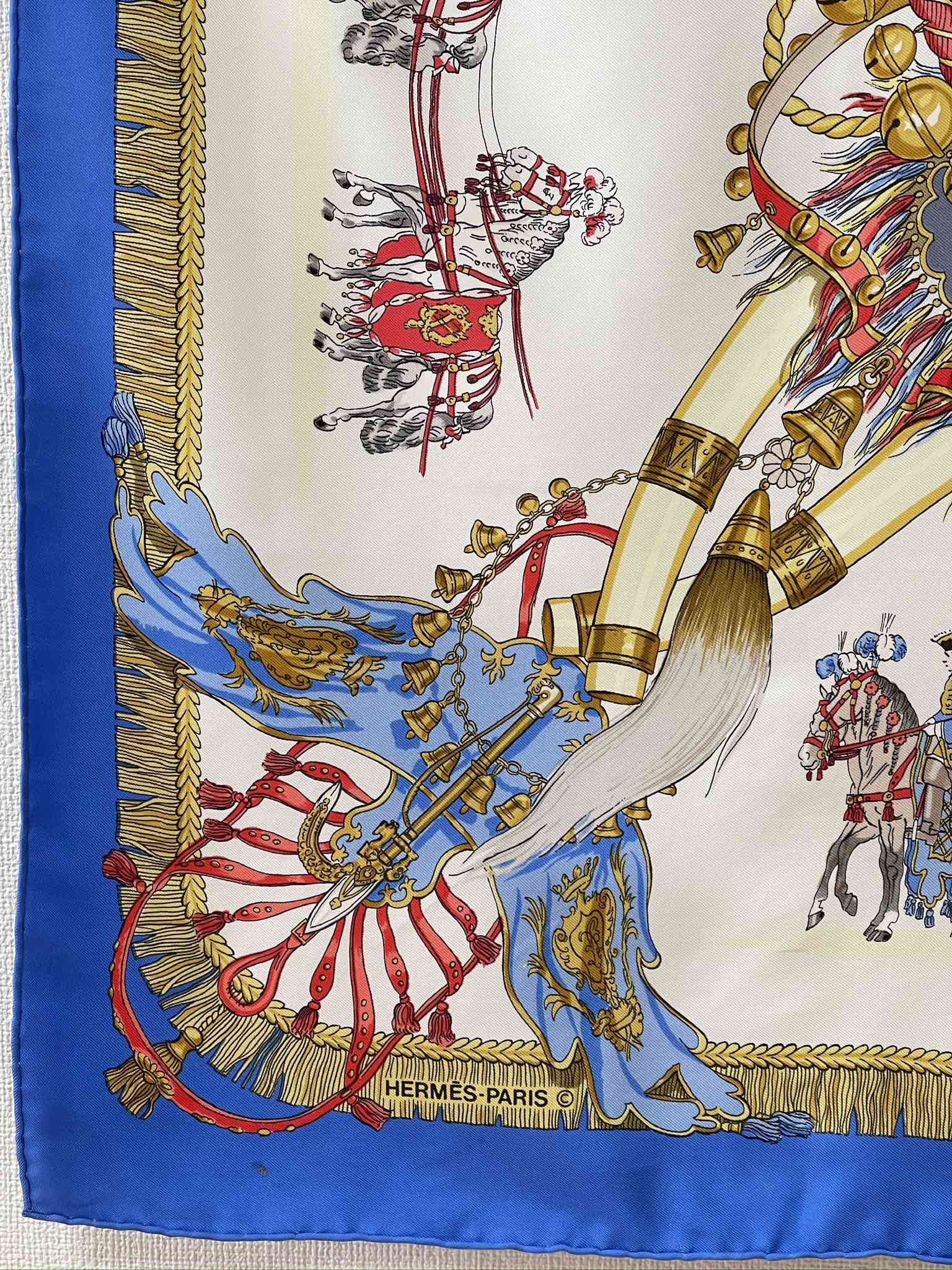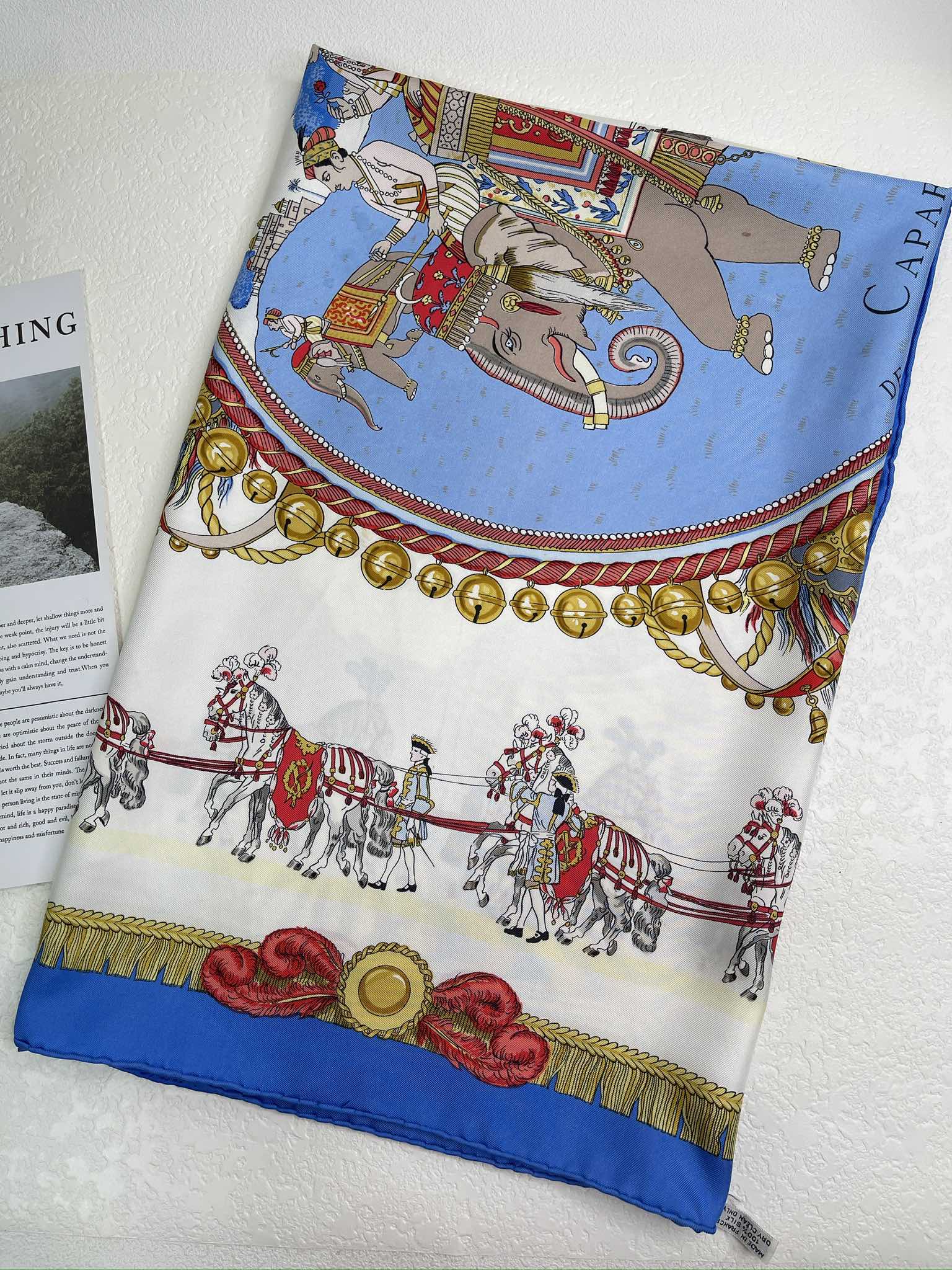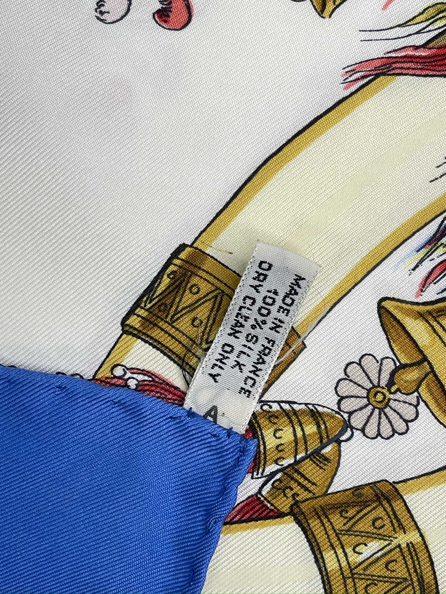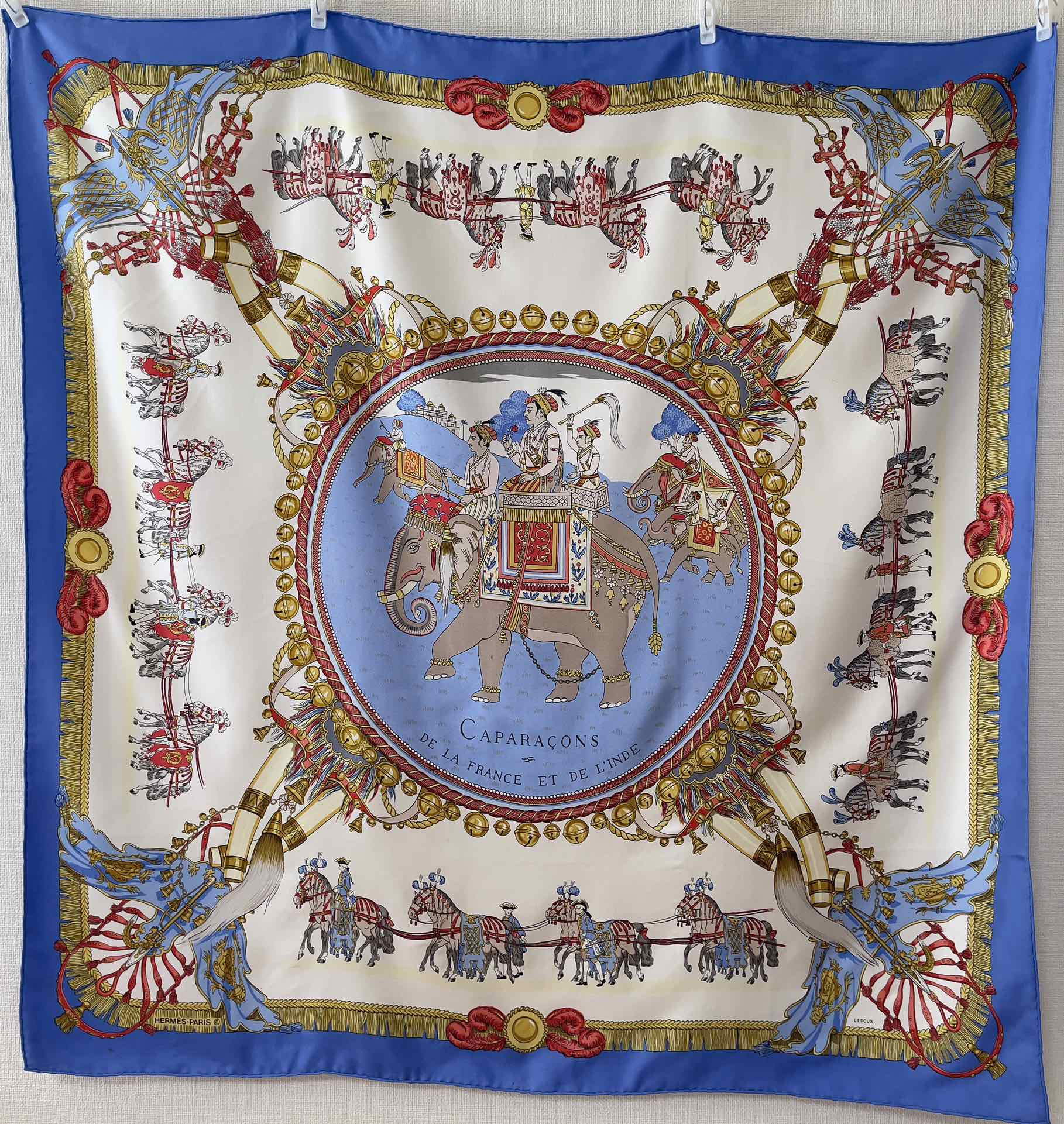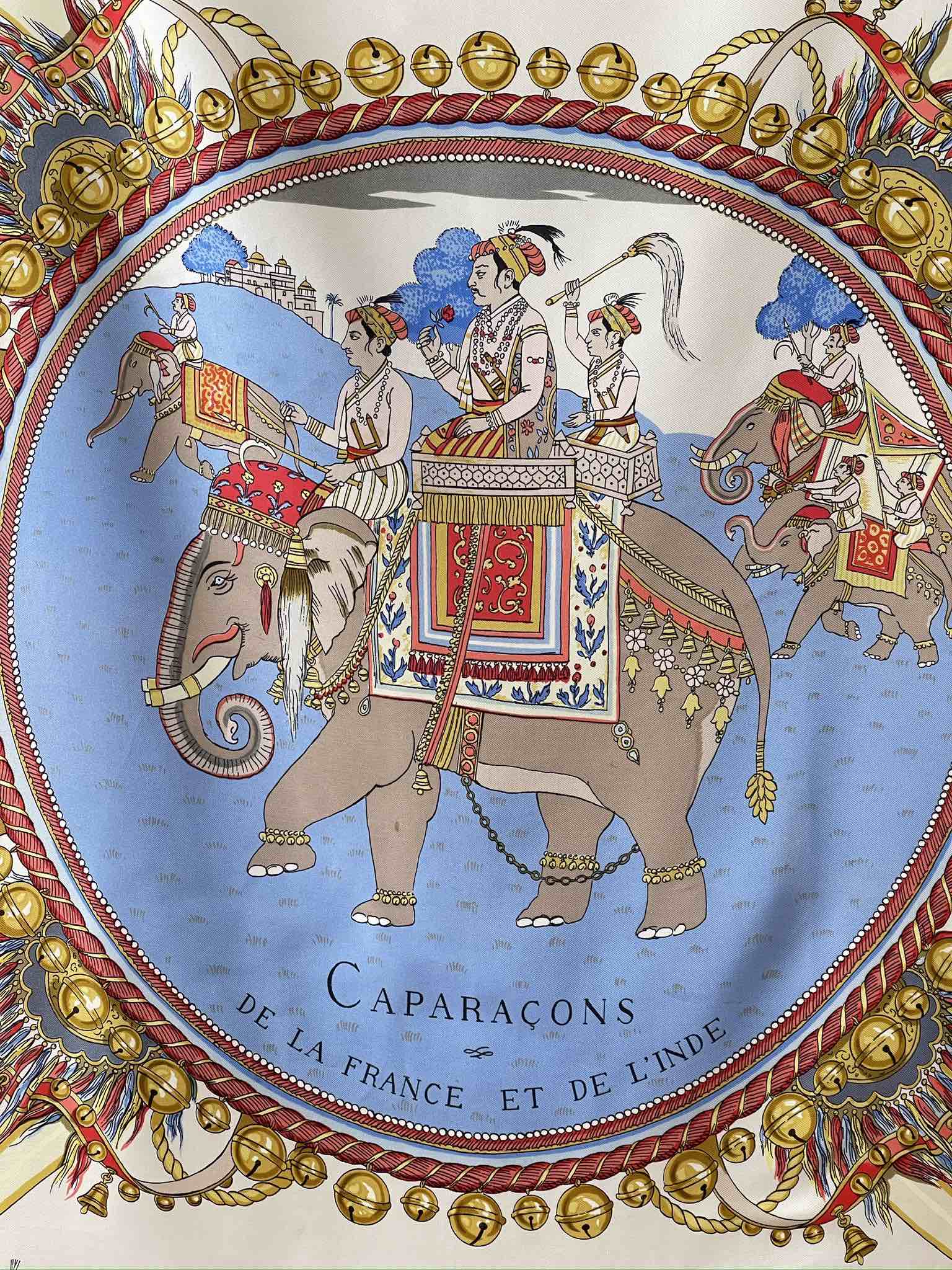 This is an authentic HERMES Silk Caparacons De La France Et De L'Inde Scarf 90. This is a stunning 100% silk scarf featuring a historic Hindu design with a central elephant enveloped in warm colors on a white background. Enjoy this scarf to be worn in many stylish ways, for the classic sophistication, only from Hermes!